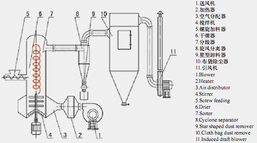 熱空氣切線進入干燥器底部,在攪拌器帶動下形成強有力的旋轉風場。膏狀物料由螺旋加料器進入干燥器內,在高速旋轉攪拌槳的強烈作用下,物料受撞擊、磨擦及剪切力的作用下得到分散,塊狀物料迅速粉碎,與熱空氣充分接觸、受熱、干燥。脫水后的干物料隨熱氣流上升,分級環將大顆粒截留,小顆粒從環中心排出干燥器 外,由旋風分離器和除塵器回收,未干透或大塊物料受離心力作用甩向器壁,重新落到底部被粉碎干燥。